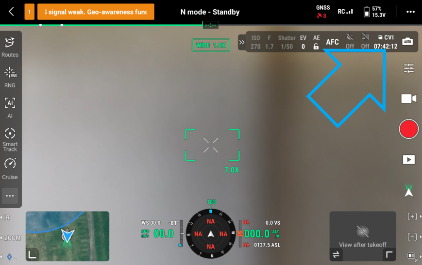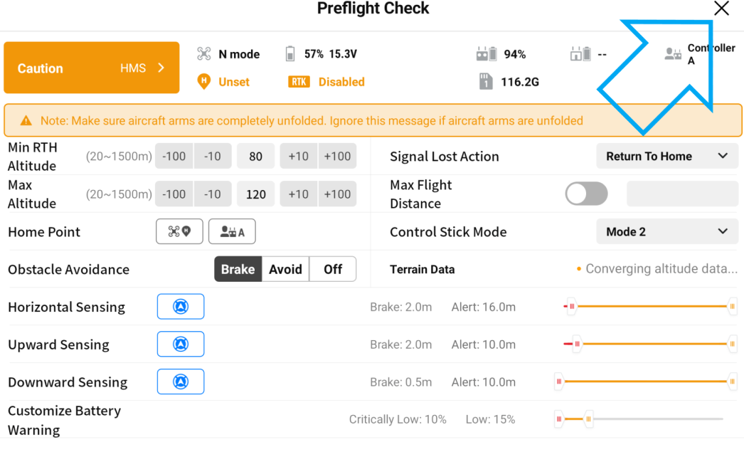 Kontrola nastavení dronu, ovladače apod. - vykřížkování vpravo nahoře - krok 3