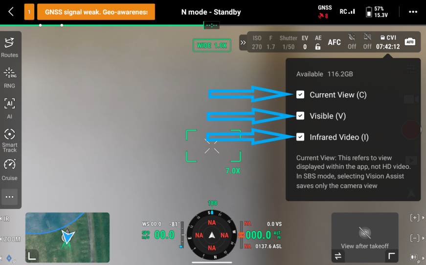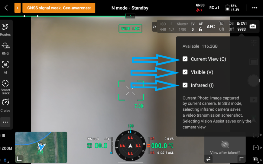- Current view - uloží fotky, které vidíte na ovladači (bez OSD - letových dat) - pokud máte např. zapnutý režim SBS - tedy rozpůlenou obrazovku na termokameru vedle klasické kamery, uloží se tento záběr